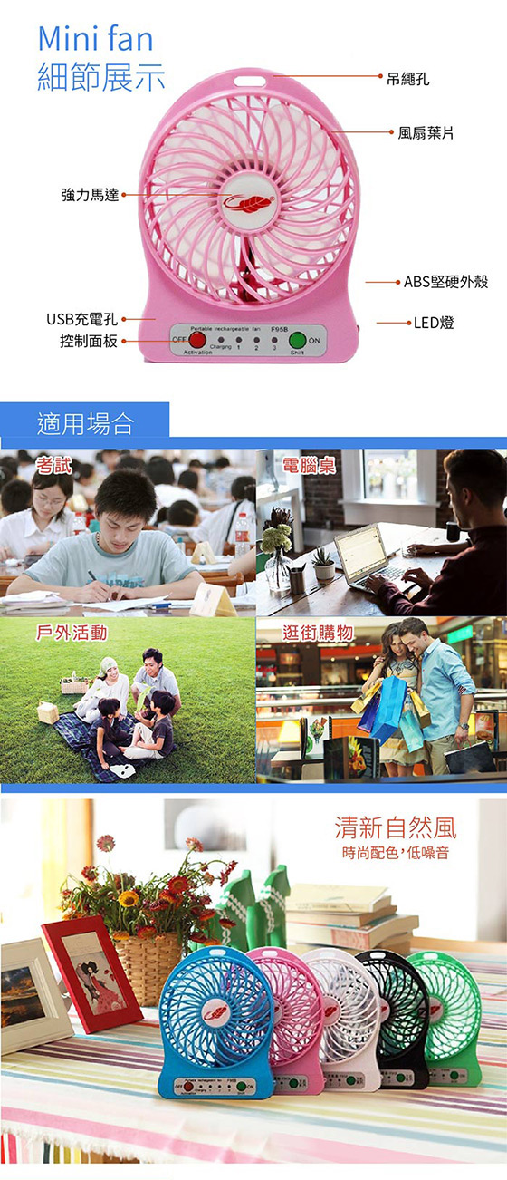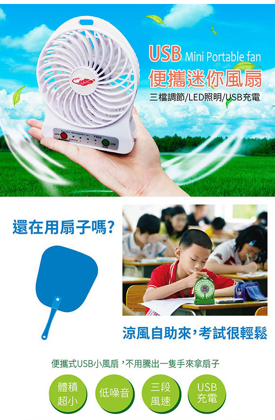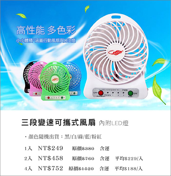 | 三段變速可攜式風扇(內附LED燈)-走到哪,吹到哪,隨時給您涼風吹拂!USB便攜小風扇,一顆電池就能運轉,低噪音、三段風速,吹出強勁風量平均每入最低只要188元起(含運)即可購得三段變速可攜式風扇(內 售價:188 我要購買 |